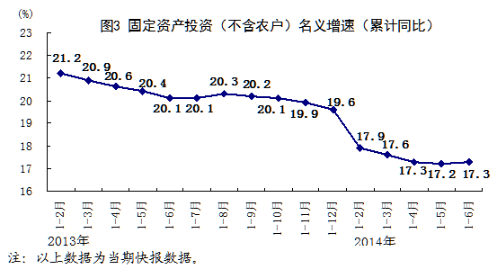 上半年,固定资产投资(不含农户)212770亿元,同比名义增长17.3%(扣除价格因素实际增长16.3%),增幅比一季度回落0.3个百分点。其中,国有及国有控股投资65667亿元,增长14.8%;民间投资138607亿元,增长20.1%,占全部投资的比重为65.1%。分地区看,东部地区投资同比增长16.3%,中部地区增长19.2%,西部地区增长18.6%。分产业看,第一产业投资4820亿元,同比增长24.1%;第二产业投资89186亿元,增长14.3%;第三产业投资118764亿元,增长19.5%。从到位资金情况看,上半年到位资金246051亿元,同比增长13.2%。其中,国家预算资金增长15.5%,国内贷款增长12.9%,自筹资金增长16.7%,利用外资下降8.3%。上半年新开工项目计划总投资196843亿元,同比增长13.6%。从环比看,6月份固定资产投资(不含农户)增长1.45%。