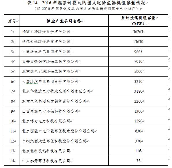 参加2016年度火电厂环保产业信息登记的环保公司中,截至2016年底累计投运的湿式电除尘器机组容量情况见表14,累计投运的低(低)温电除尘器机组容量情况见表15。