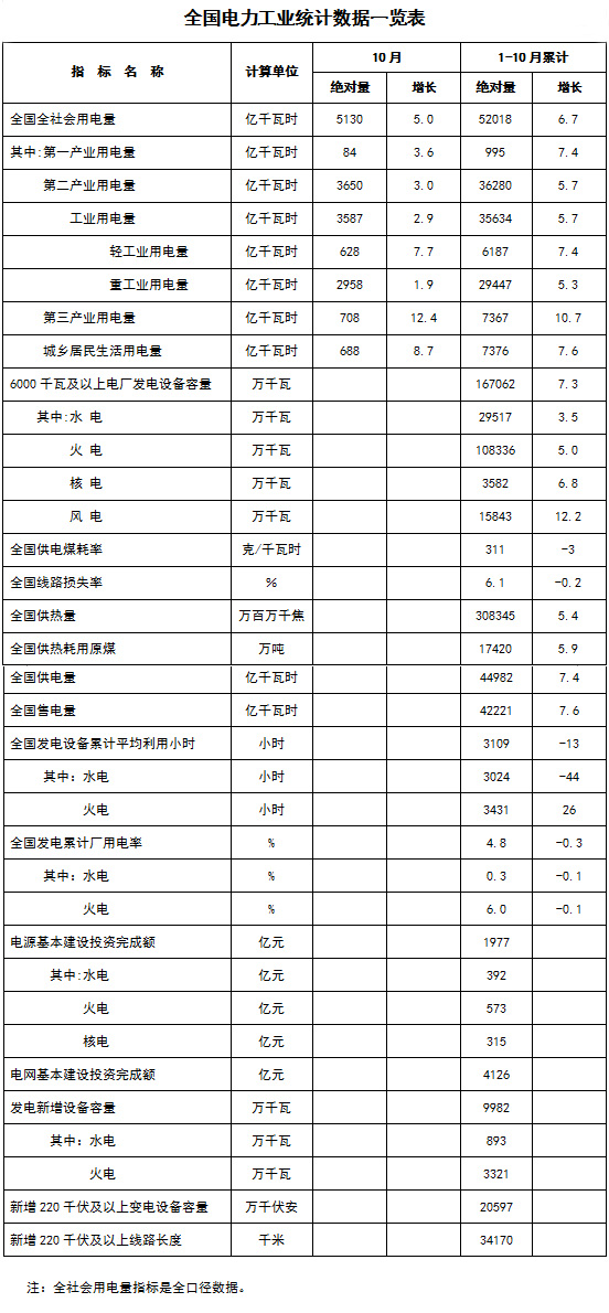 11月22日,国家能源局发布1-10月份全国电力工业统计数据。